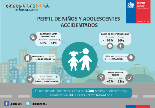 Gómez-Lobo agregó que el 41% de los niños y adolescentes fallecidos y el 27% de los lesionados son peatones, mientras que solamente el 10% de niños y adolescentes fallecidos y el 9% de lesionados fueron conductores (en su mayorÃa conductores de bicicleta).