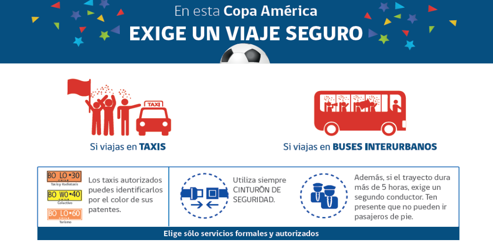 Dado que la Copa América generará un aumento de la demanda de viajes por tierra entre las distintas ciudades sede, el Programa de Fiscalización del Ministerio de Transportes y Telecomunicaciones contempla un reforzamiento de los operativos de control de buses interurbanos, minibuses y taxis, además del transporte informal en las cercanÃas de los terminales de buses y en los aeropuertos, con el objeto de garantizar un viaje seguro para las personas.