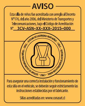 La certificación del sistema de retención infantil quedará demostrada por un sello de color amarillo. La presencia de este sello es un indicador de que el SRI fue revisado, testeado y validado por la autoridad para ser usado por niños pequeños.