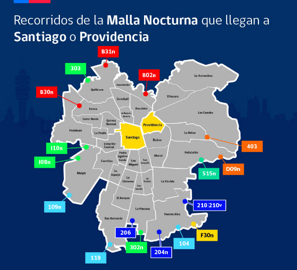 Como parte de la constante revisión y mejoramiento de los servicios del Transantiago, la ministra de Transportes y Telecomunicaciones, Paola Tapia, través del Directorio de Transporte Público Metropolitano, presentó los recorridos con los que contará la nueva malla nocturna del sistema, que alcanza un total de 48 servicios que circularán durante la madrugada por las comunas del Gran Santiago.