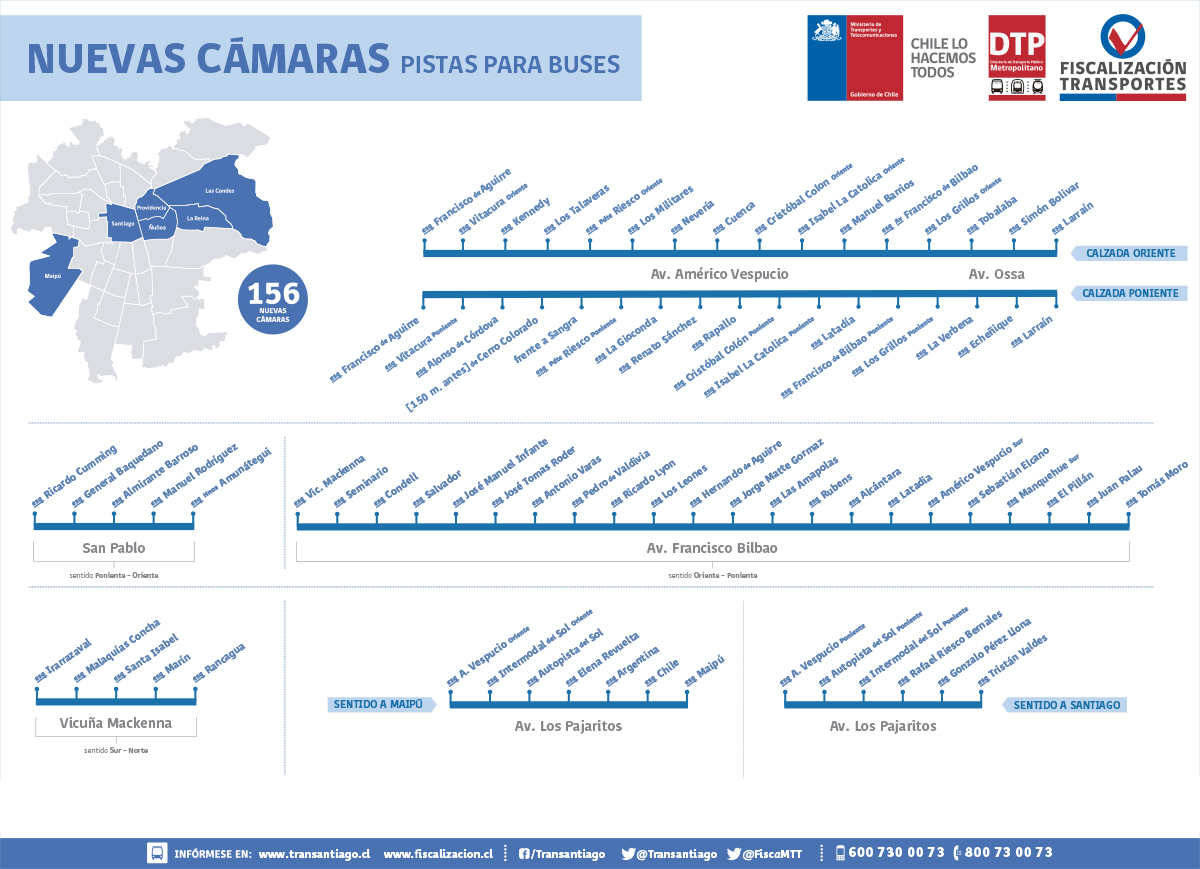 También, desde el próximo martes, comenzarán a cursarse formalmente partes a quienes no respeten las nuevas pistas Solo Bus fiscalizadas con 156 cámaras: Américo Vespucio Oriente, Bilbao, Pajaritos, San Pablo y el corredor de Vicuña Mackenna.