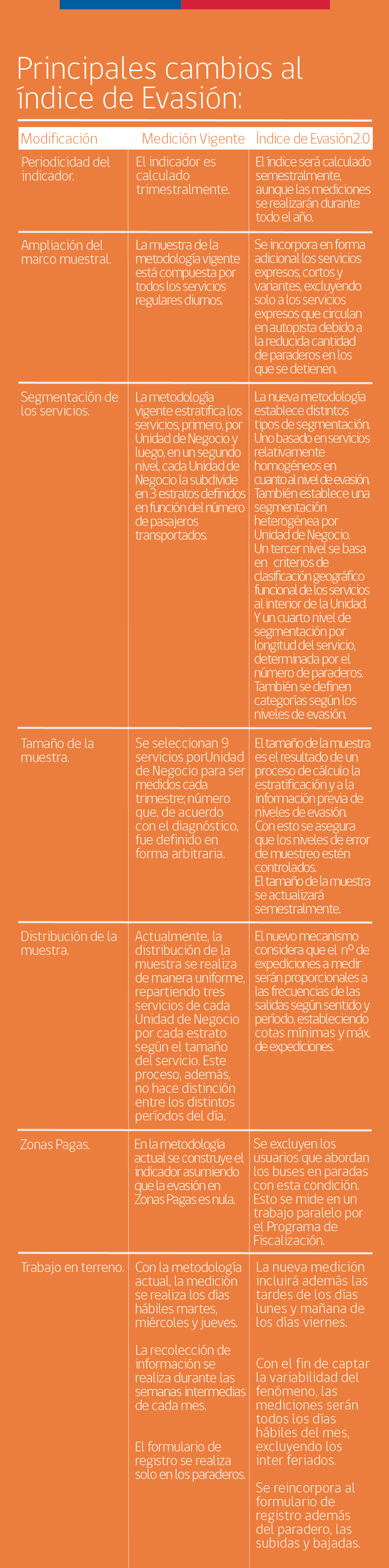 Entre los principales beneficios que traer谩 esta nueva metodolog铆a se destaca que el indicador tendr谩 mayor representatividad a distintos niveles ya que se ampliar谩 el marco muestral de la medici贸n, incorporando m谩s servicios, m谩s d铆as de fiscalizaci贸n y una distribuci贸n de la muestra por servicio-sentido-per铆odo garantizar representatividad horaria y focalizar las medidas en diferentes horas del d铆a. Tambi茅n se elaborar谩 una cifra general del sistema, incluyendo las mediciones de Metro y Tren Central y se obtendr谩 una radiograf铆a cifra de evasi贸n por unidad de servicios con m谩rgenes de error controlados.