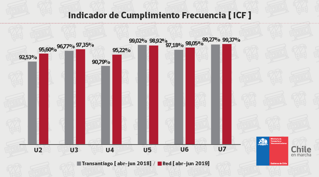 Con la implementación gradual del estándar RED, la frecuencia de buses mejoró desde un 95,05 % a un 97,21 % y el Ãndice de regularidad de los servicios subió desde 82,50 % a 85,10%, en comparación con el mismo trimestre de 2018.