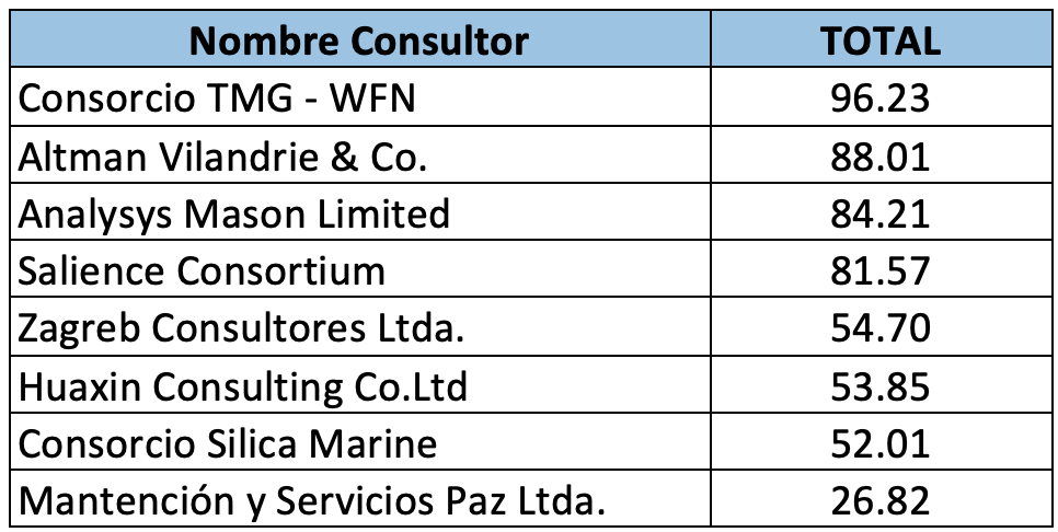 La postulante ganadora fue el consorcio conformado por las empresas Telecommunications Management Group Inc. (TMG) y WFN Strategies LLC. (WFN), las cuales poseen una vasta experiencia en la realizaci贸n de estudios similares que han resultado en proyectos exitosos en los 煤ltimos a帽os.聽