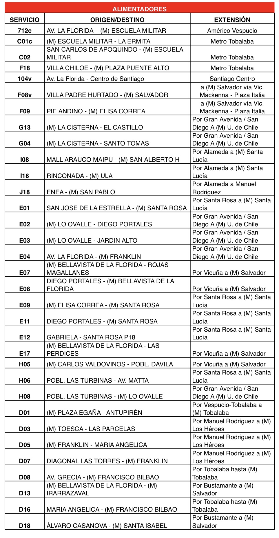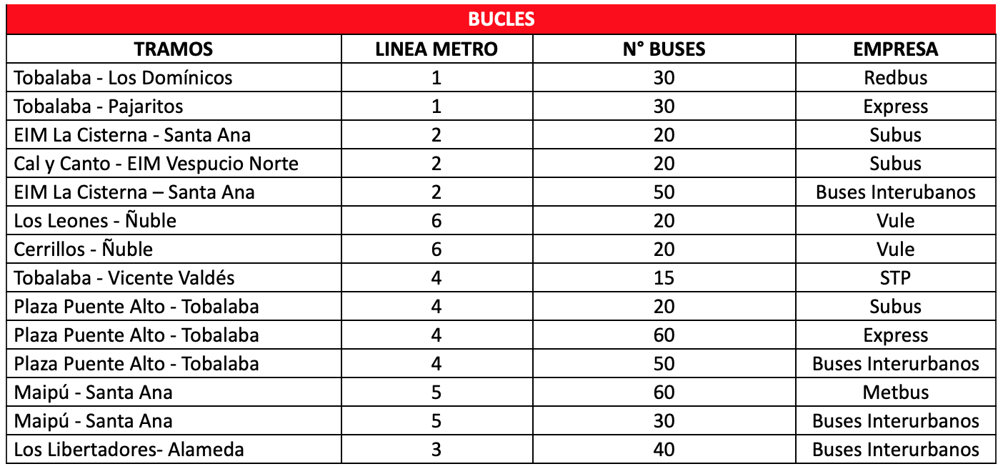 Dado este nuevo escenario, el Ministerio de Transportes y Telecomunicaciones readecuó su plan de contingencia con el fin de reforzar las lÃneas de Metro que aún no están operativas y las zonas de mayor demanda. Asà los servicios de Apoyo Metro contarán con 465 buses especialmente en los tramos Plaza Puente Alto – Tobalaba, Maipú – Santa Ana, La Cisterna – Santa Ana y se sumará un refuerzo al tramo que va entre Los Libertadores – Alameda.