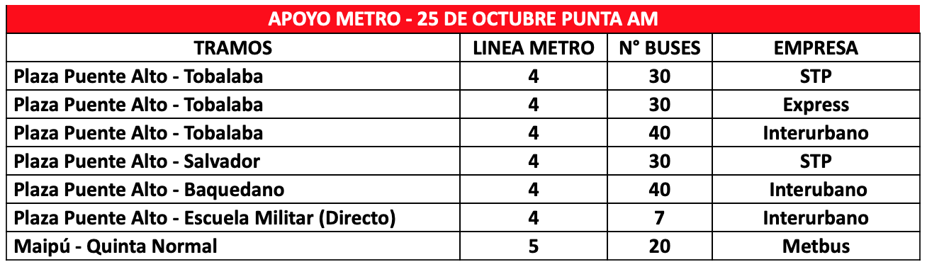 Habrá 197 buses de apoyo, especialmente a los tramos Tramo Plaza Puente Alto – Tobalaba, Plaza Puente Alto – Baquedano, Plaza Puente Alto – Salvador, Plaza Puente Alto – Escuela Militar y Maipú – Quinta Normal.