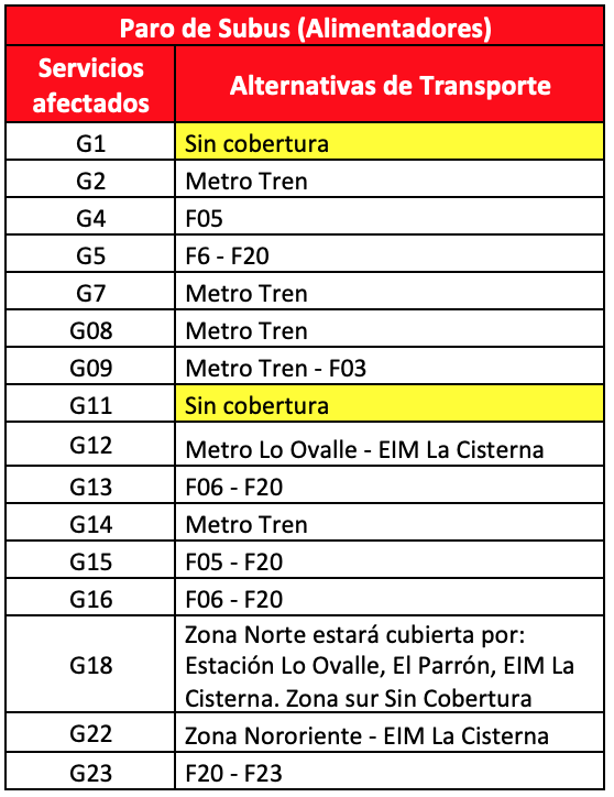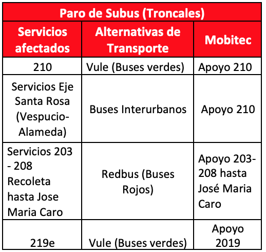 Ante el anuncio de paro de conductores de la empresa Subus, y la apertura de las LÃneas 2 y 5 se modificó la oferta de servicios para reforzar los recorridos 200 y de la Zona G que recorren las comunas de La Pintana, San Bernardo, El Bosque. Esta zona será reforzada por servicios F que estarán operando en el Eje Esperanza, Lo MartÃnez y Gabriela. En tanto desde los servicios 210 serán reforzado por buses Vule que operarán con “Apoyo 210″ en el Mobitec. Los servicios 203 y 208 que provienen desde La Pincoya serán reforzados por servicios de Redbus que dirán en su Mobitec “Apoyo 203- 208 hasta José MarÃa Caro”.