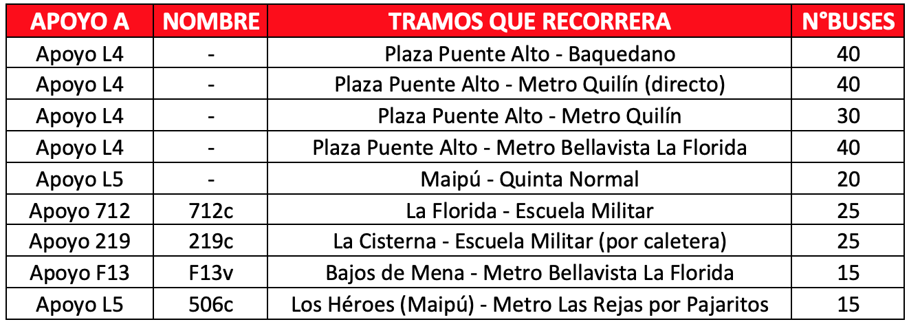 Respecto a los buses de apoyo, habrá 250 buses adicionales para reforzar la operación. En total son 9 servicios que permitirán a los usuarios de las comunas de Puente Alto, La Florida, La Cisterna y Maipú tener mayores alternativas para llegar a las estaciones de Metro que están operando.