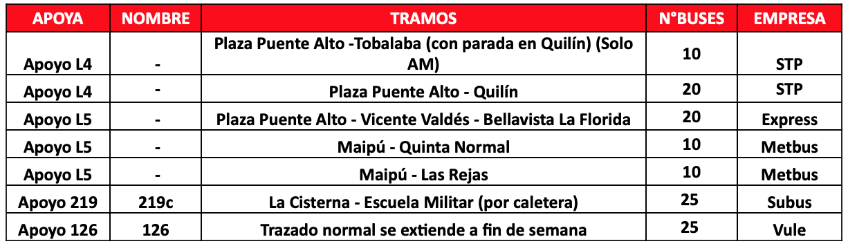 Aquà el detalle de los buses de apoyo, se indica a qué recorrido y/o lÃnea de Metro apoyan y el tramo que recorrerá: