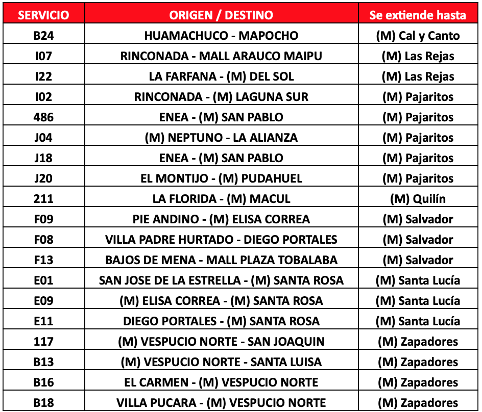 En total son 7 servicios que permitirán a los usuarios de las comunas de Puente Alto, La Florida, La Cisterna y Maipú tener mayores alternativas para llegar a las estaciones de Metro que están operando.