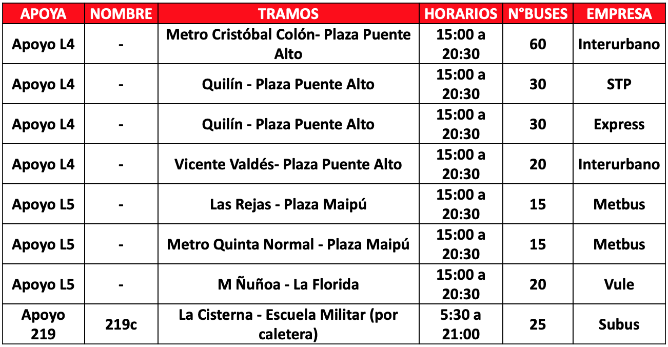 Asimismo, al igual que la semana pasada, se reforzarán los servicios con 215 buses Apoyo Metro, especialmente a quienes utilizan las LÃneas 4 y 5. Serán en total 8 servicios que permitirán a los usuarios de las comunas de Puente Alto, La Florida, La Cisterna y Maipú tener mayores alternativas para llegar a las estaciones de Metro que están operando.