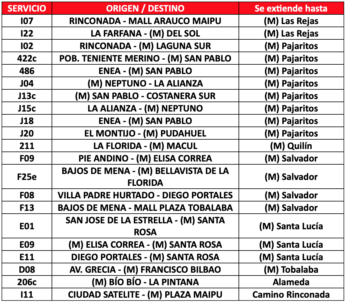 Aquà el detalle de los buses de apoyo, con el detalle del recorrido que realizan y/o la lÃnea de Metro apoyan: