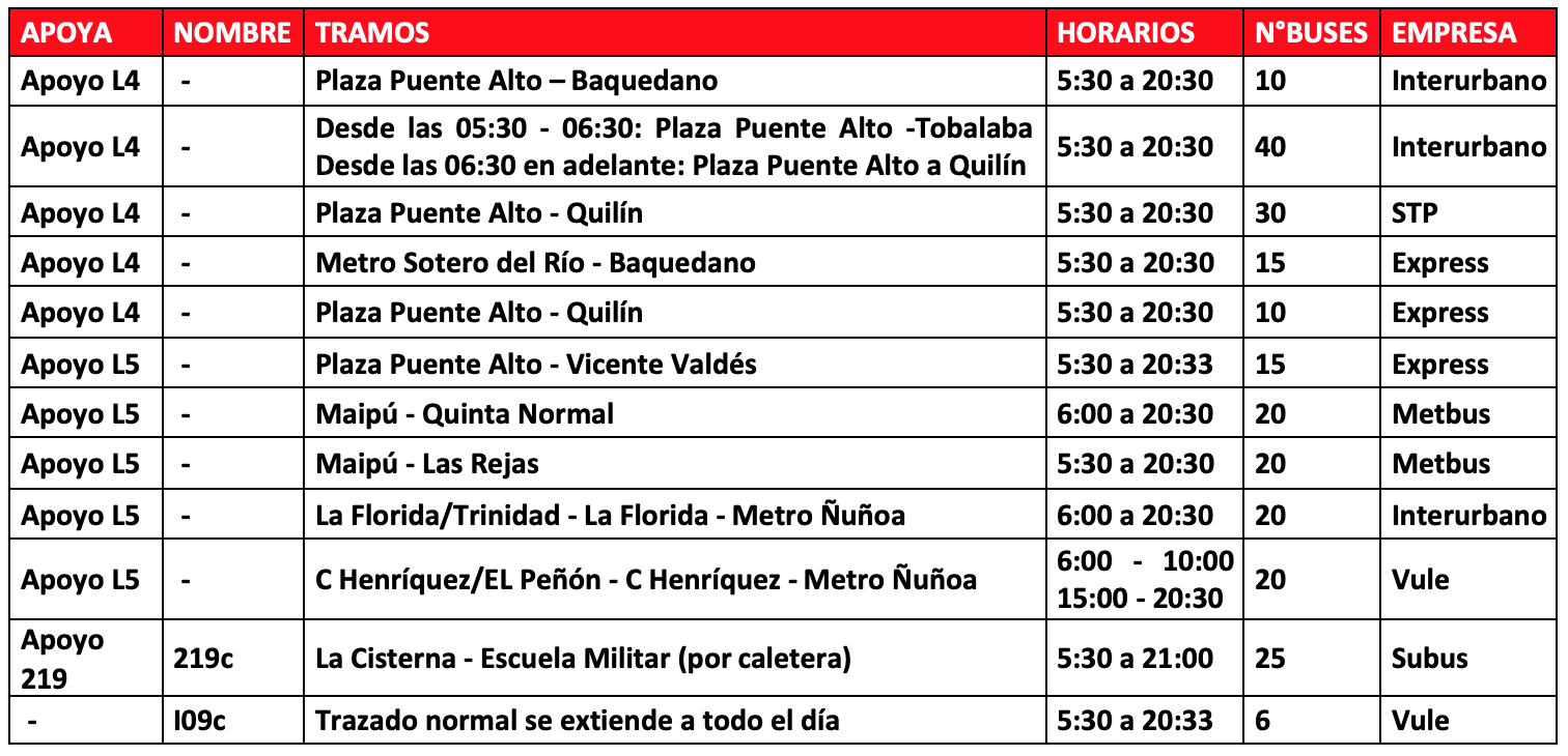 Respecto a los buses de apoyo, habrá 231 buses adicionales para reforzar la operación. Serán en total 12 servicios que permitirán a los usuarios de las comunas de Puente Alto, La Florida, La Cisterna y Maipú tener mayores alternativas para llegar a las estaciones de Metro que están operando o cerradas.
