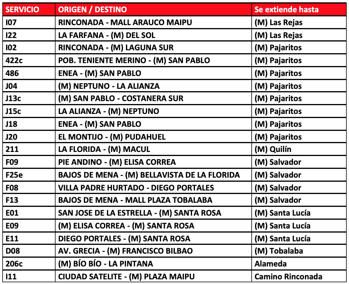 Para garantizar el correcto funcionamiento del sistema, se mantienen los refuerzos de apoyo y extensiones de servicio hacia las estaciones de Metro que aún permanecen cerradas, esto principalmente en las comunas de Puente Alto, La Florida, La Cisterna y Maipú.