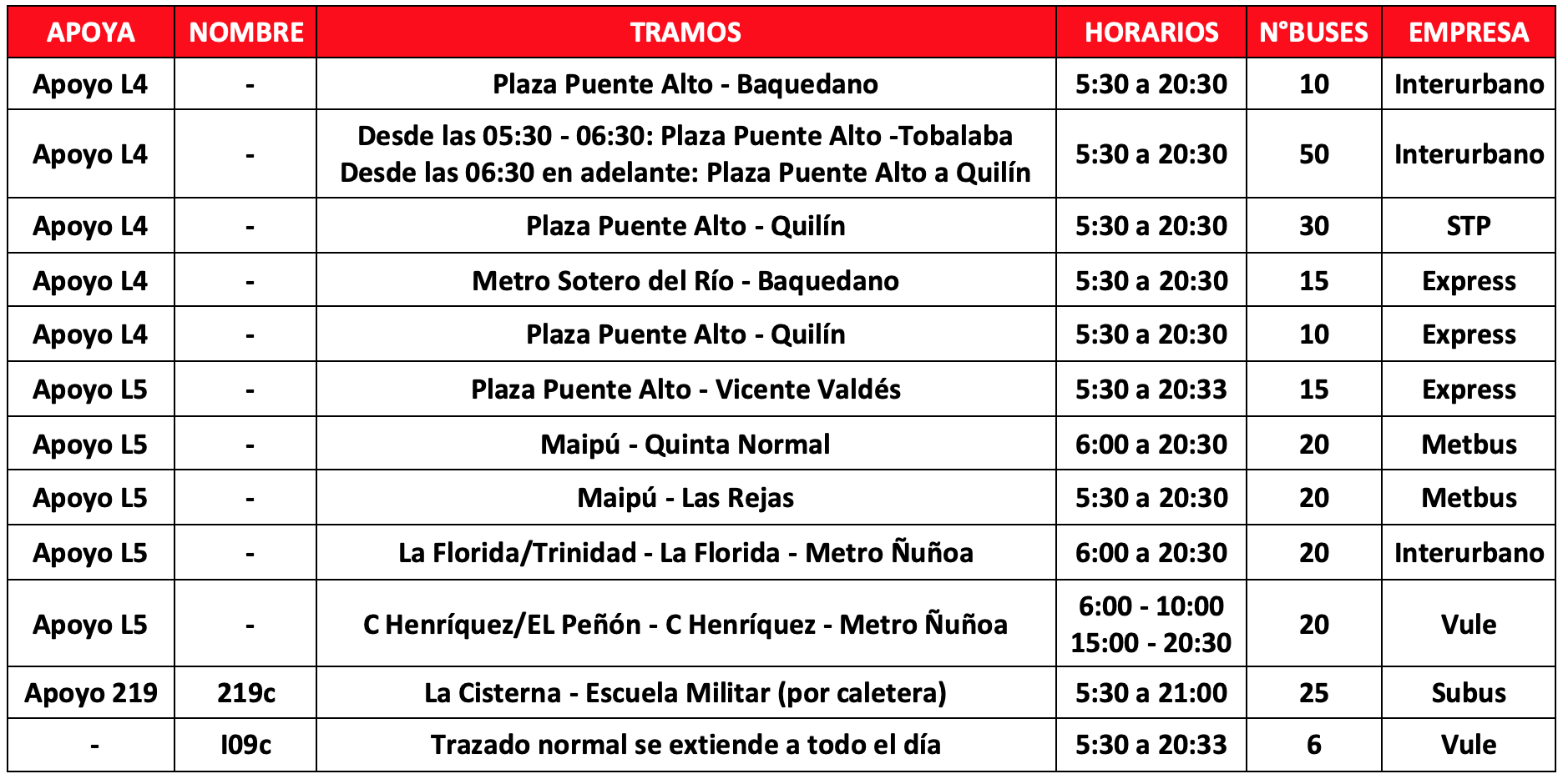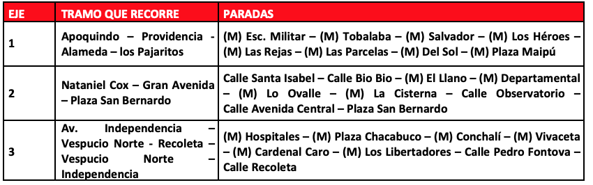 Aquà el detalle de los buses de apoyo, donde se indica a qué recorrido y/o lÃnea de Metro apoyan y el tramo que recorrerá: