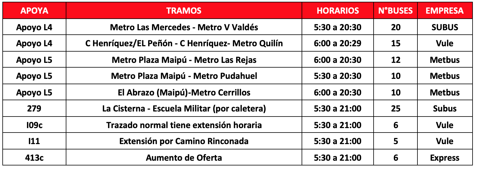 Respecto a los buses de apoyo, habrá 109 buses adicionales para reforzar la operación que se distribuirán en 9 servicios que permitirán a los usuarios de las comunas de Puente Alto, La Florida, La Cisterna y Maipú tener más alternativas de transporte en los tramos en que aún no está funcionado Metro.
