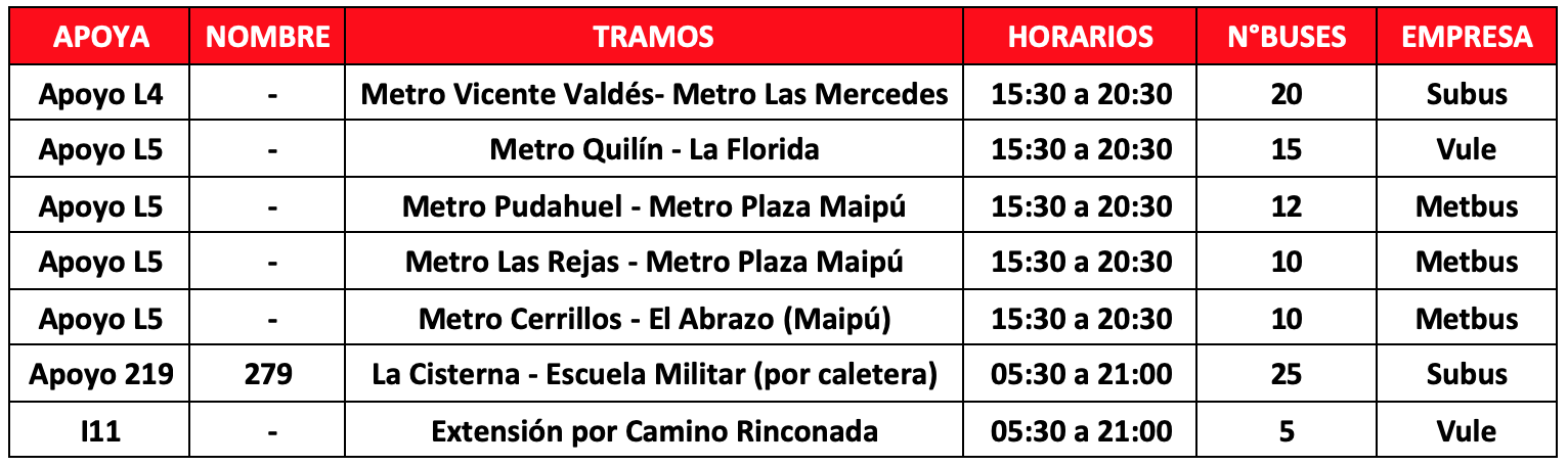 Hay que considerar que estos servicios de apoyo funcionan en forma adicional a los servicios habituales que también ofrecen cobertura a este sector. Se precisa que estos servicios de apoyo serán realizados por buses del sistema, lo que permite además suspender la operación de buses interurbanos.