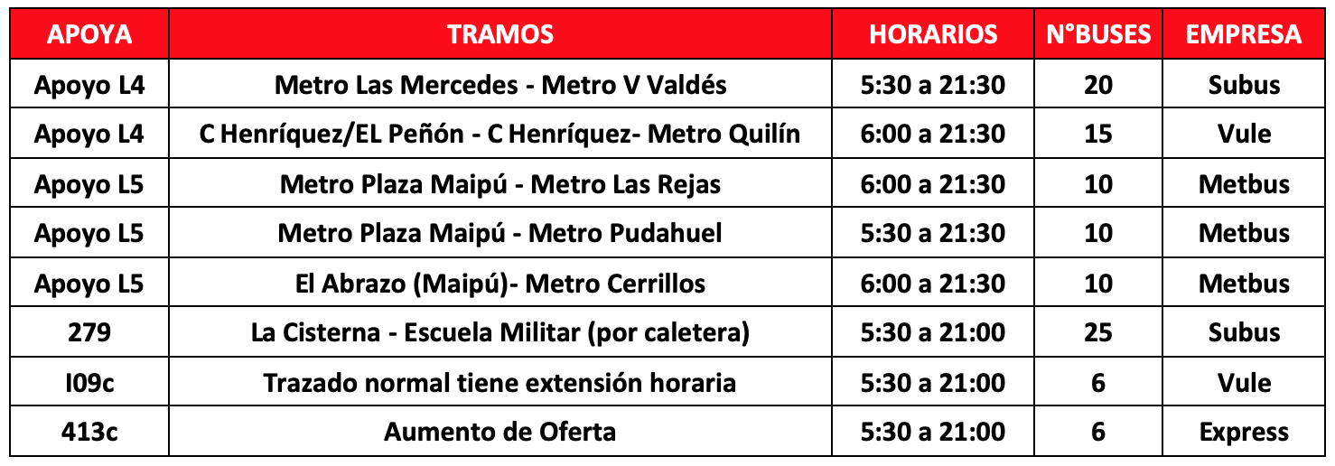 Desde de este lunes 25 de noviembre, se contará con 102 buses de apoyo a Metro distribuidos en 8 servicios y 15 extensiones de servicios, todo esto para facilitar el traslado de los usuarios principalmente en las comunas de Puente Alto, La Florida, La Cisterna y Maipú.