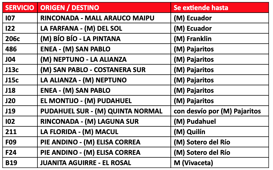 Desde hoy Metro y MetroTren Nos Alameda extenderá sus operaciones hasta las 21:00 hrs por lo que los servicios de buses de apoyo se extenderán hasta las 21:30