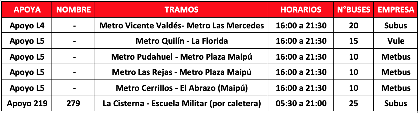 Hay que considerar que estos servicios de apoyo funcionan en forma adicional a los servicios habituales que también ofrecen cobertura a este sector. Se precisa que estos servicios de apoyo serán realizados por buses del sistema, lo que permite además suspender la operación de buses interurbanos.