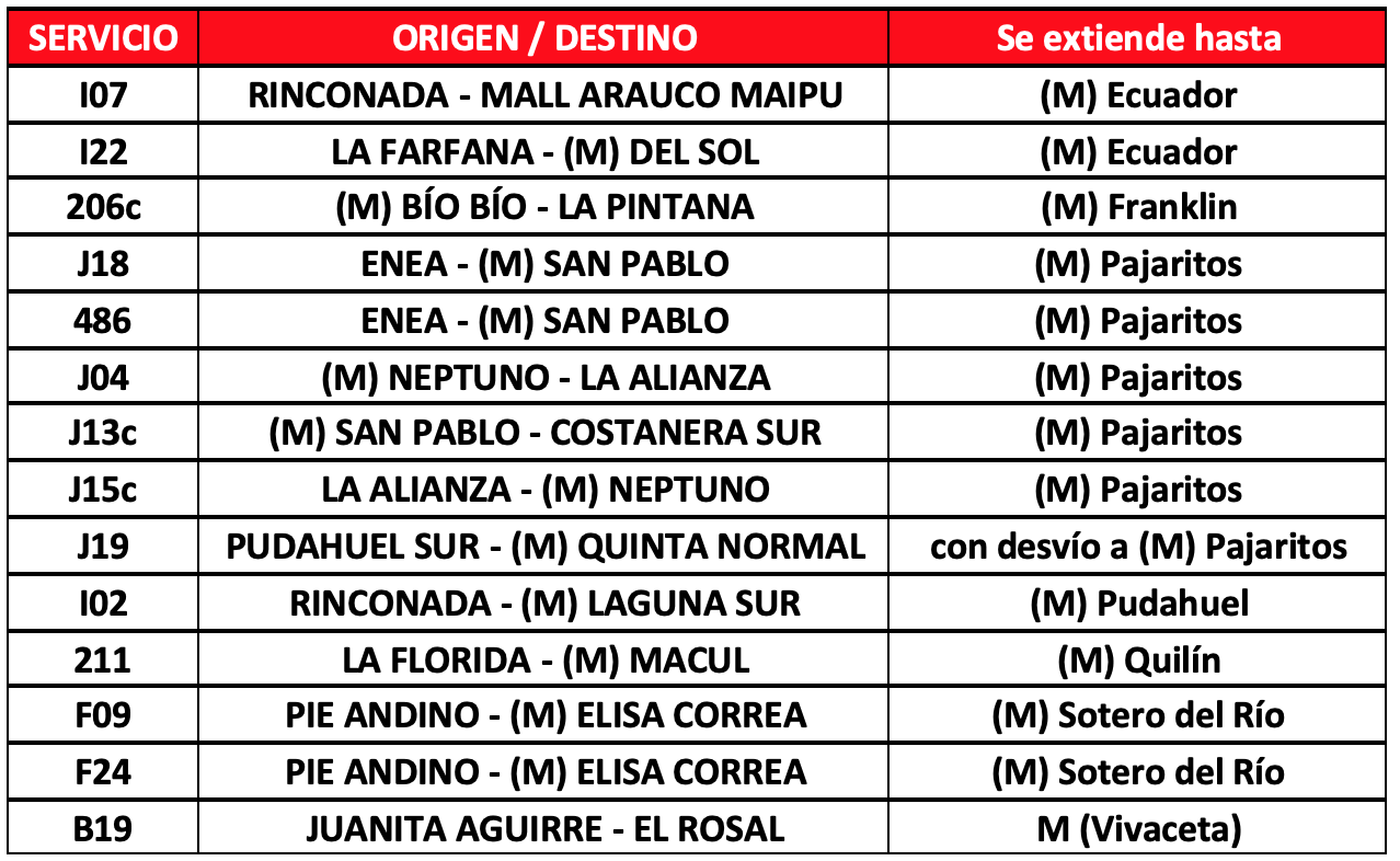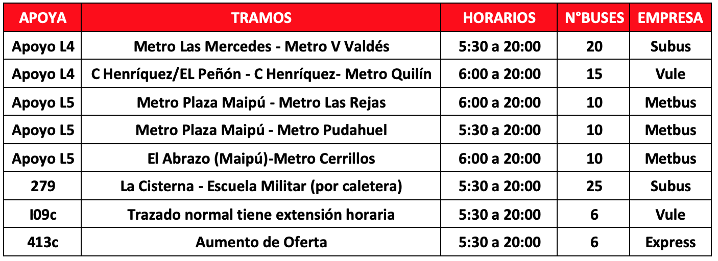 Respecto a los buses de apoyo, se mantienen los 102 buses adicionales para reforzar la operación que se distribuirán en 8 servicios que permitirán a los usuarios de las comunas de Puente Alto, tener una alternativa de transporte en los tramos en que no está funcionado Metro. En caso de requerir más apoyos por aumento de aglomeraciones se activarán más servicios de buses.