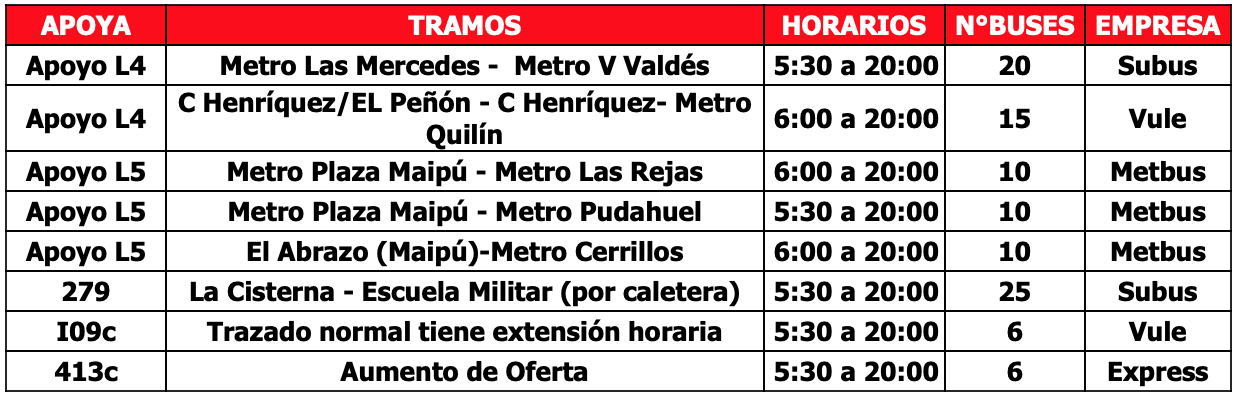 Respecto a los buses de apoyo, se mantienen los 102 buses adicionales para reforzar la operación que se distribuirán en 8 servicios que permitirán a los usuarios de las comunas de Puente Alto, La Florida, La Cisterna y Maipú, tener más alternativas de transporte en los tramos en que no está funcionado Metro. El funcionamiento de estos servicios será en principio hasta las 21:30 horas.