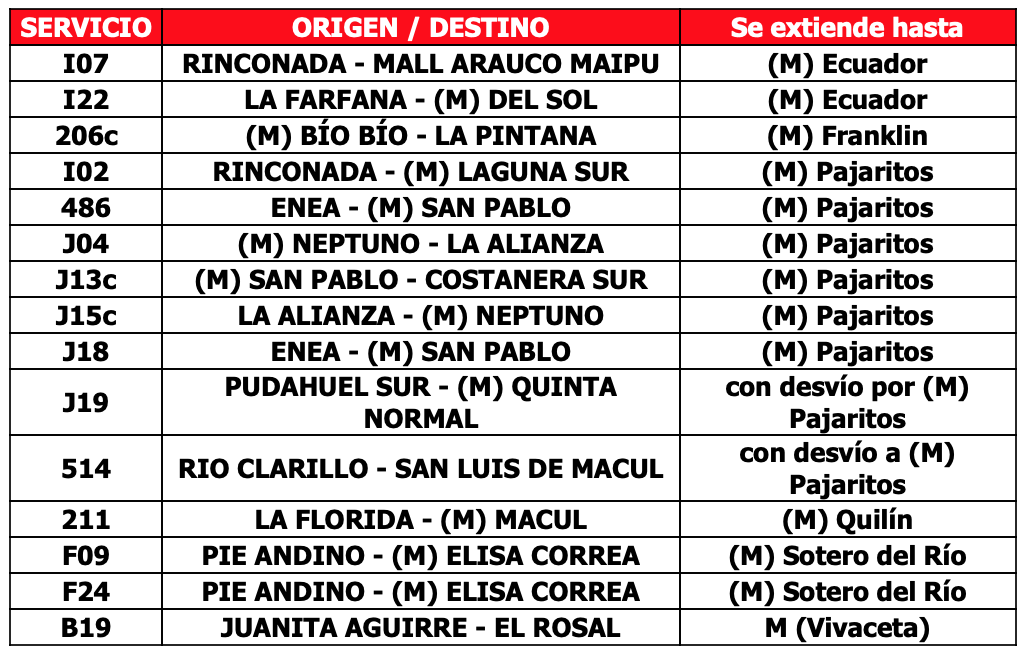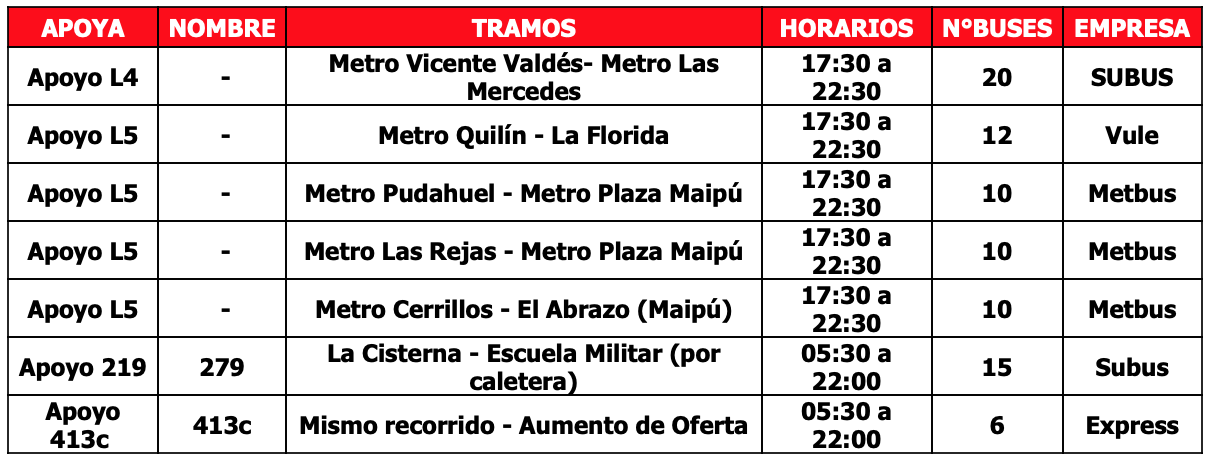 Los recorridos habituales tendrán las últimas salidas de buses desde los terminales (despachos) a las 22:00 horas, coincidiendo con el término de la operación del Metro. En cuanto a los servicios de apoyo a Metro y las extensiones de servicio, tendrán sus últimas salidas a las 22:30 horas para trasladar a los usuarios del ferrocarril subterráneo que deben continuar sus viajes.