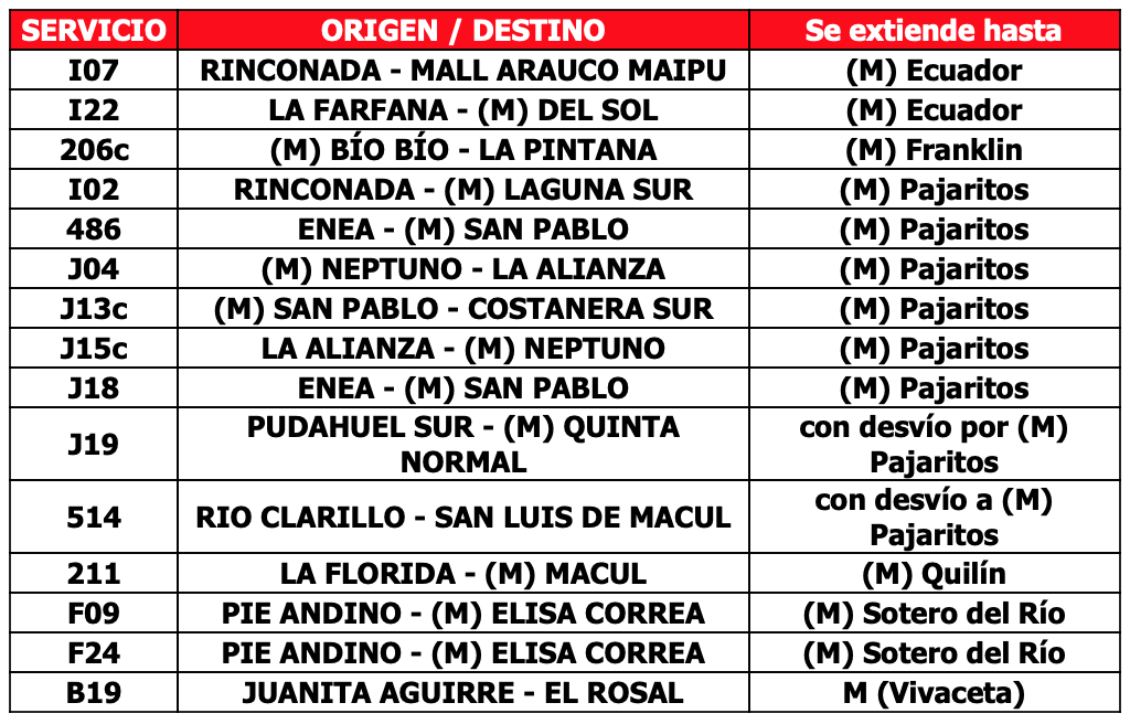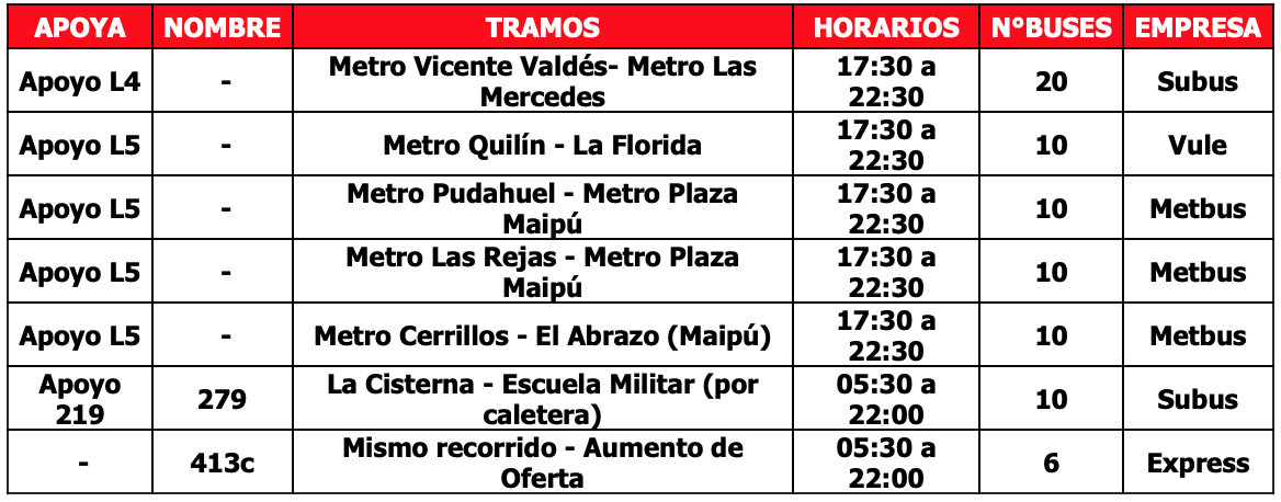 Además, se mantienen los apoyos a Metro y las extensiones de los dÃas anteriores. Serán 76 buses los que prestarán servicios de apoyo a Metro y que permitirán a los usuarios de las comunas de Puente Alto, La Florida, La Cisterna y Maipú tener mayores alternativas para llegar a las estaciones de Metro que están operando.