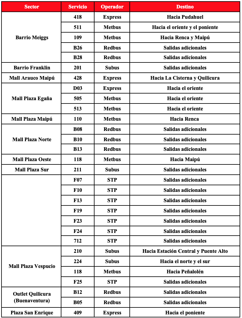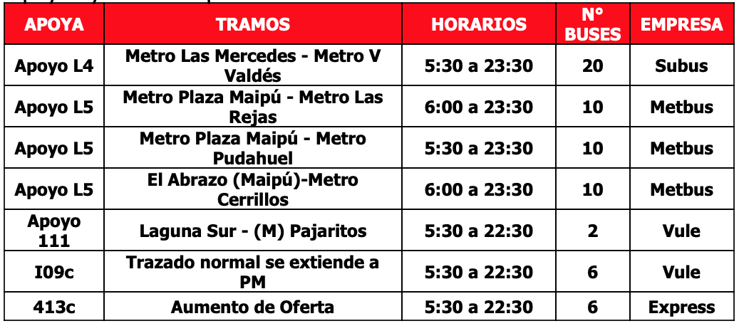 Respecto a los buses de apoyo, se contará con 64 buses adicionales para reforzar la operación que se distribuirán en 7 servicios que permitirán a los usuarios de las comunas de Puente Alto, Maipú, Pudahuel, La Cisterna y La Florida, tener una alternativa de transporte en los tramos en que no está funcionado Metro. En caso de requerir más apoyos por aumento de aglomeraciones se activarán más servicios de buses.