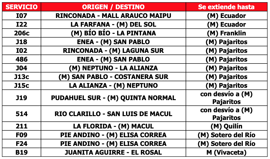 Al igual que en dÃas anteriores, y gracias al compromiso de los dirigentes gremiales y responsables de lÃneas de taxis colectivos, los servicios se mantendrán de forma habitual, con extensiones hasta el centro de Santiago y hasta estaciones de Metro que se encuentren habilitadas. Esto principalmente en las comunas de Maipú y Puente Alto.