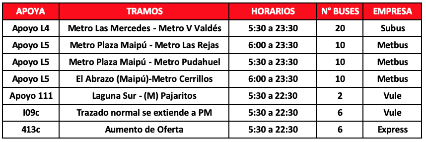 Respecto a los buses de apoyo, se contará con 64 buses adicionales para reforzar la operación que se distribuirán en 7 servicios que permitirán a los usuarios de las comunas de Puente Alto, Maipú, Pudahuel, La Cisterna y La Florida, tener una alternativa de transporte en los tramos en que no está funcionado Metro. En caso de requerir más apoyos por aumento de aglomeraciones se activarán más servicios de buses.
