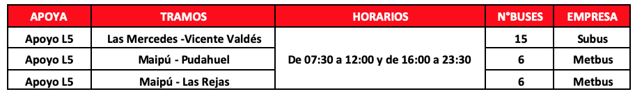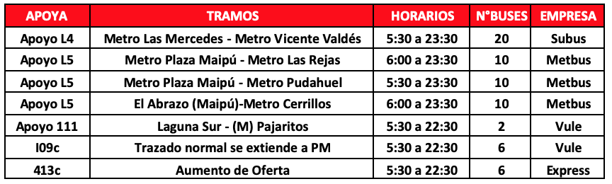 Respecto a los buses de apoyo, se contará con 64 buses adicionales para reforzar la operación que se distribuirán en 7 servicios que permitirán a los usuarios de las comunas de Puente Alto, Maipú, Pudahuel, La Cisterna y La Florida, tener una alternativa de transporte en los tramos en que no está funcionado Metro. En caso de requerir más apoyos por aumento de aglomeraciones se activarán más servicios de buses.