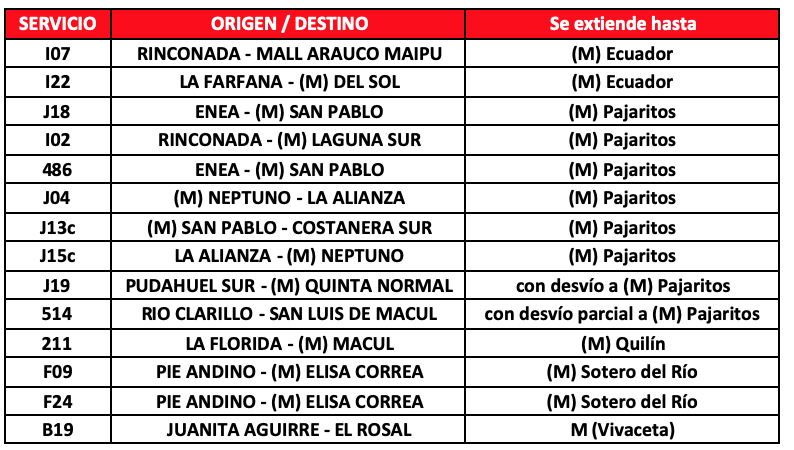 Adicionalmente, se contará con 27 buses, que se distribuirán en 3 servicios, y 10 extensiones de recorridos para cubrir aquellos tramos en que aún existen estaciones de Metro cerradas, que operarán hasta las 23:30.