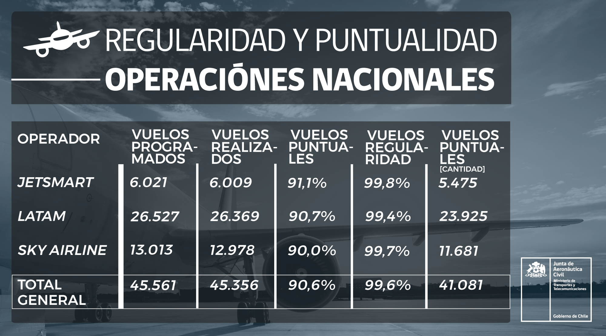 En términos de puntualidad de las aerolíneas nacionales, el listado lo lidera JetSmart con 91,1% (5.475 vuelos puntuales), seguido de Latam con 90,7% (23.925 vuelos puntuales) y luego Sky Airline con 90% (11.681 vuelos puntuales).
