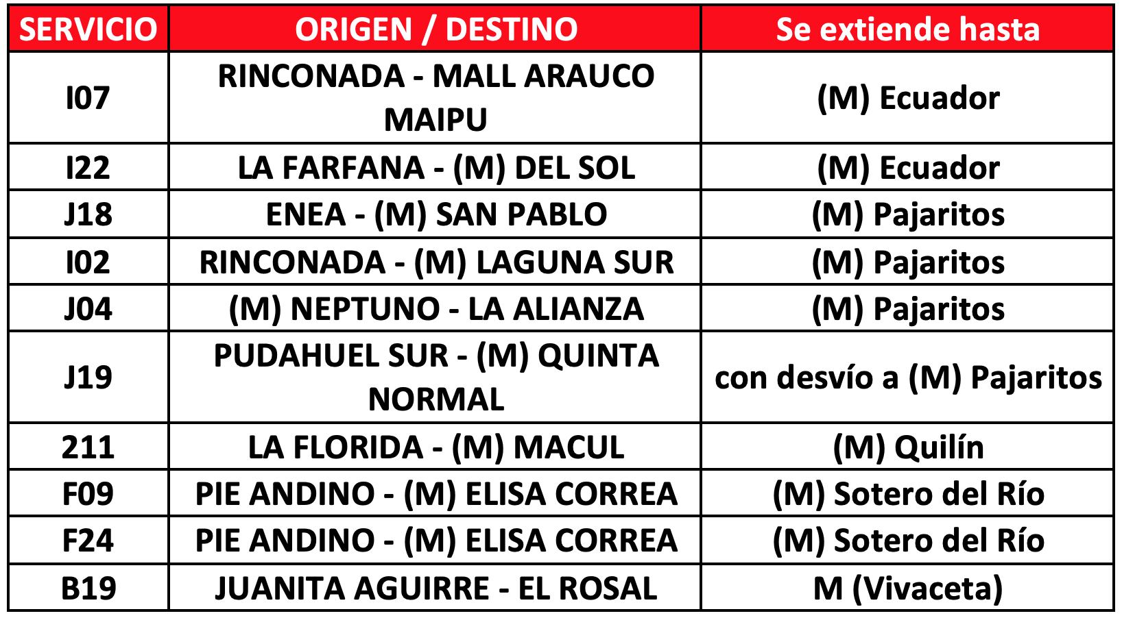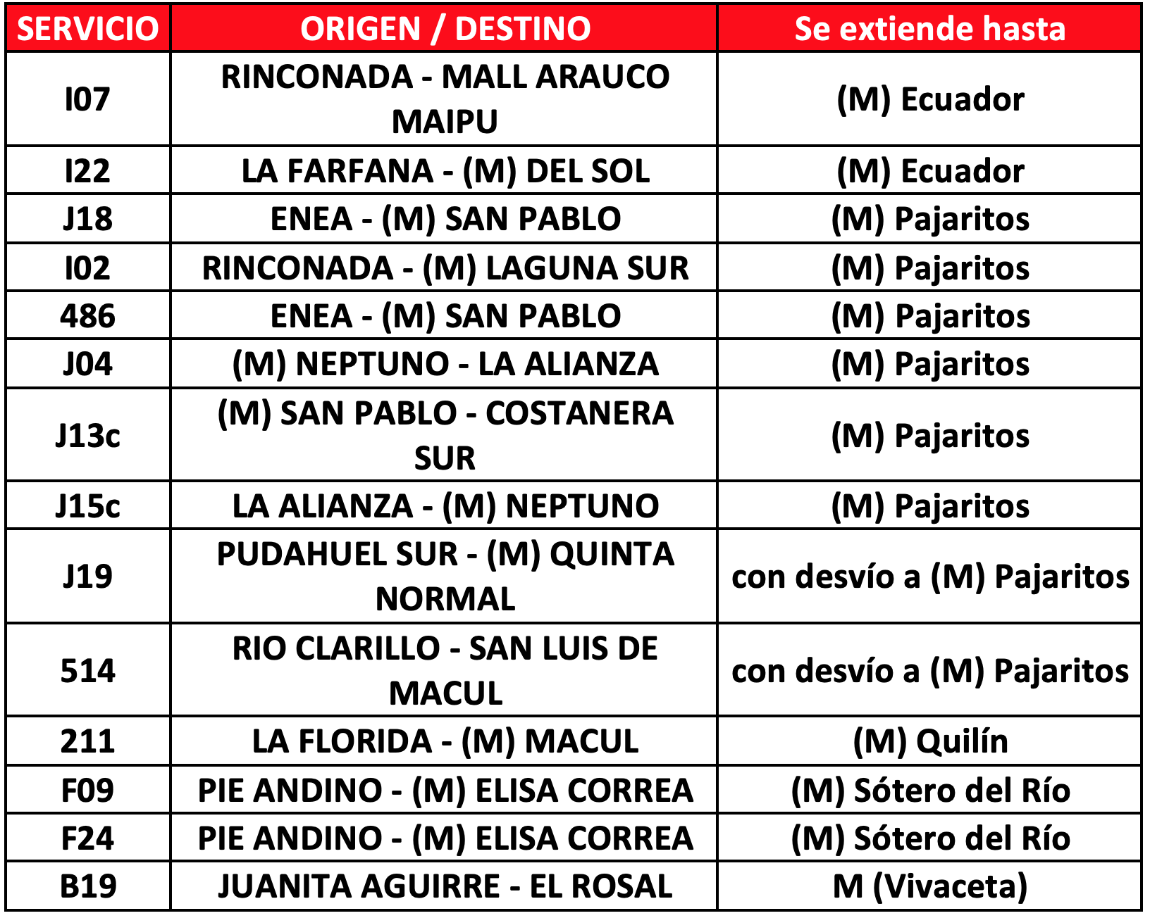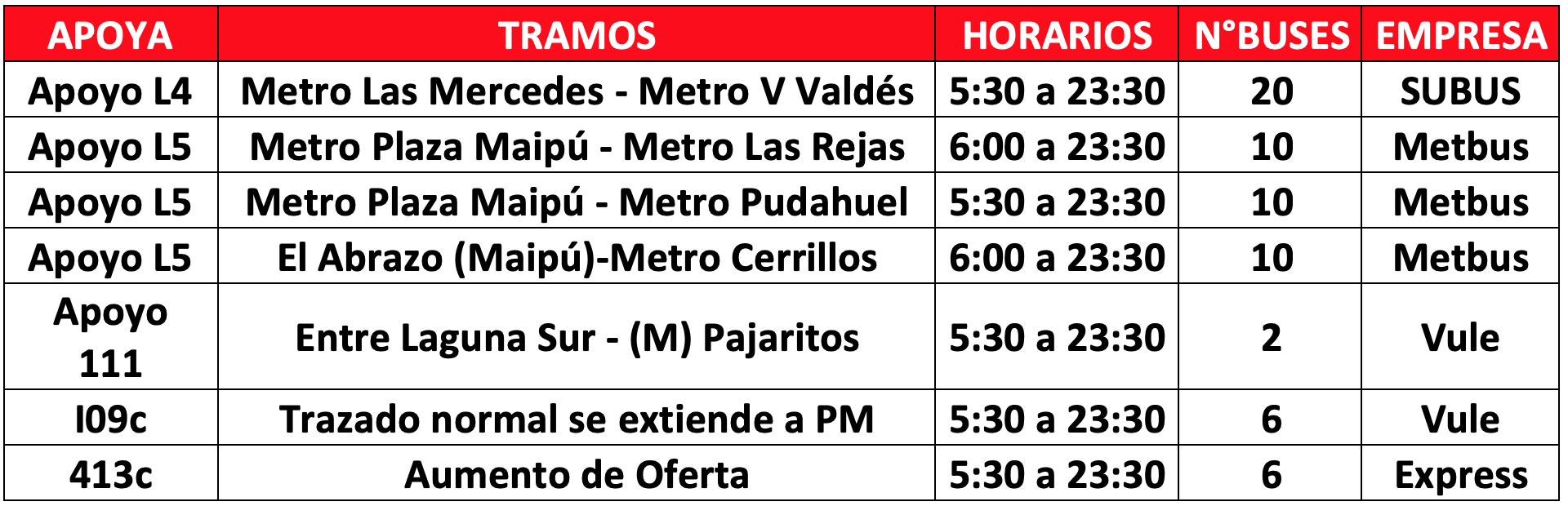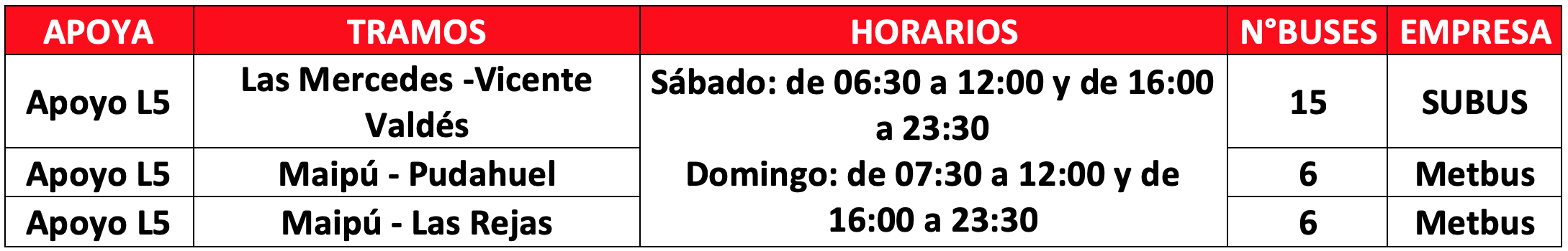 Desde el 18 de octubre se ha implementado un plan de apoyo a las L铆neas 4 y 5 de Metro, lo que continuar谩 funcionando hasta la recuperaci贸n de las estaciones que contin煤an cerradas, principalmente en las comunas de Puente Alto, La Florida, La Cisterna y Maip煤. Esto, a trav茅s de servicios especiales para aquellos tramos que presentan una mayor cantidad de pasajeros. 聽As铆, de lunes a viernes se dispondr谩 de 64 buses de apoyo al Metro y el s谩bado y domingo de 27. En ambos casos, funcionar谩n en horarios punta ma帽ana y punta tarde. A ello se suman 14 servicios que extender谩n sus recorridos a estaciones de Metro que est茅n disponibles.