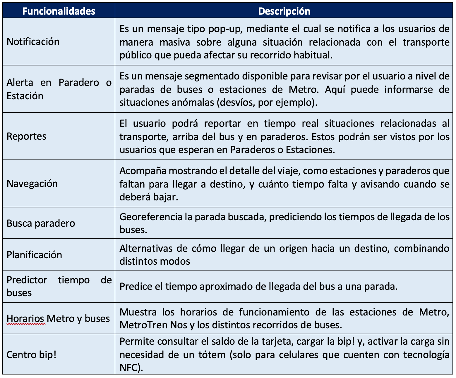 鈥淨uienes la descarguen podr谩n, por ejemplo, informarse sobre eventuales problemas de infraestructura, como paraderos en mal estado o buses con problemas. La aplicaci贸n tambi茅n establece un sistema de alertas posibilitando que los usuarios que esperan en un paradero de bus, una estaci贸n de Metro, reciban alertas georreferenciadas, indicando situaciones excepcionales que les afecten como desv铆os de buses, interrupciones en la red de Metro o afectaci贸n de servicios por situaciones externas鈥, agreg贸 la Secretaria de Estado.