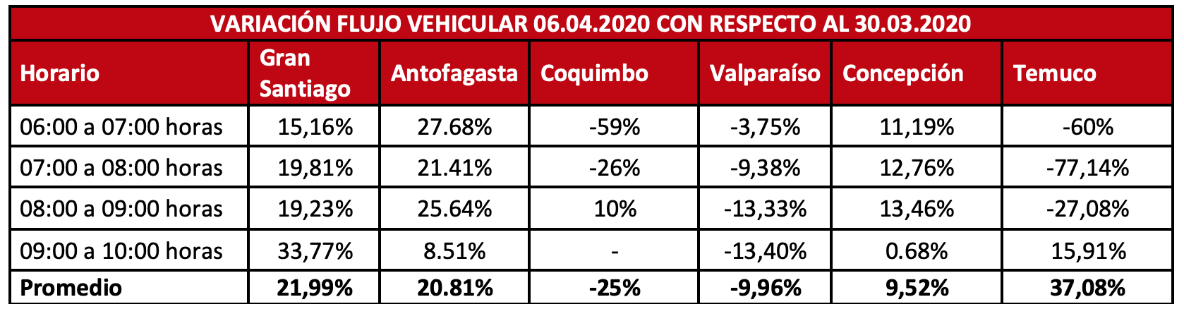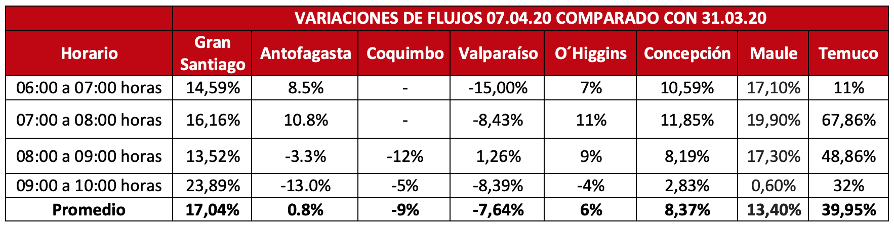 En regiones los datos muestran algo similar: un aumento de un 20,8% en Antofagasta durante el lunes y de un 37% en el caso de Temuco. En el caso de esta última ciudad, durante la jornada de hoy el incremento fue de hasta un 39,9% en hora punta, en comparación con el mismo rango del martes pasado.