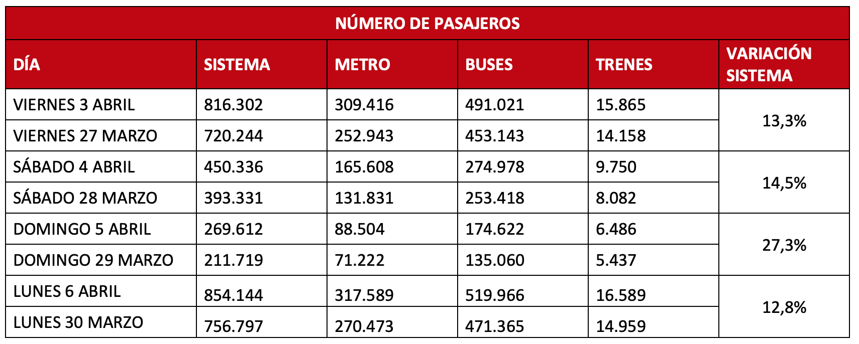 Los trenes del transporte público capitalino también vieron un aumento, de 14.158 pasajeros a 15.865, equivalente a un 12% más. AsÃ, el Sistema de Transporte Público Metropolitano observó un incremento de un 13,3%, pasando de las 720.244 transacciones el viernes 27 de marzo a las 816.302 el viernes 3 de abril.