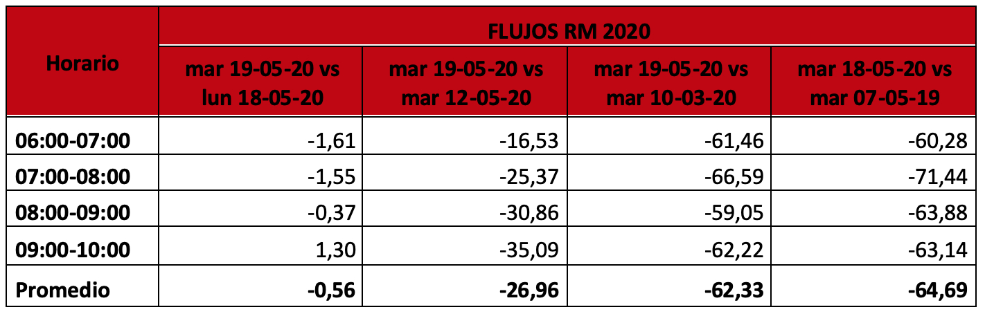 En cuanto a los datos de flujos vehiculares, éstos también mostraron una disminución de un 61,3% en comparación con el martes 10 de marzo, y de 64,6% en relación al martes 7 de mayo de 2019.
