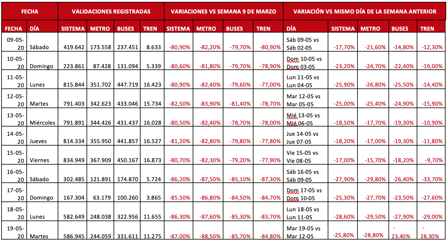 El Sistema de Transporte Público Metropolitano tuvo, por segundo dÃa consecutivo, la mayor disminución de validaciones desde que comenzó la pandemia. Durante todo el martes, se registró un 87% menos de transacciones que el miércoles 11 de marzo, y un 25,8% menos que el miércoles de la semana pasada.