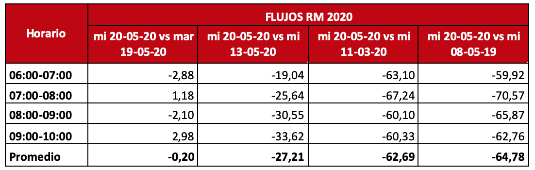 60% en comparación con la semana del 9 de marzo. En este caso, entre las 6:00 hrs. y las 10:00 hrs. circularon un 62,69% menos de vehÃculos en la Región metropolitana. SI se compara con el miércoles de la semana pasada, los flujos vehiculares en ese intervalo horario fueron de -27,21% durante esta mañana.