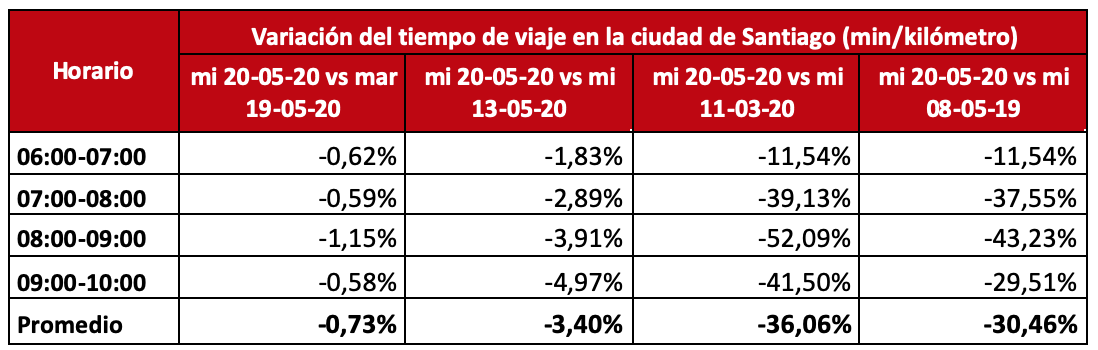 En cuanto a los tiempos de viaje, estos disminuyeron en un 36,06% en comparación con el miércoles 11 de marzo y un 3,4% en relación con el miércoles de la semana pasada.