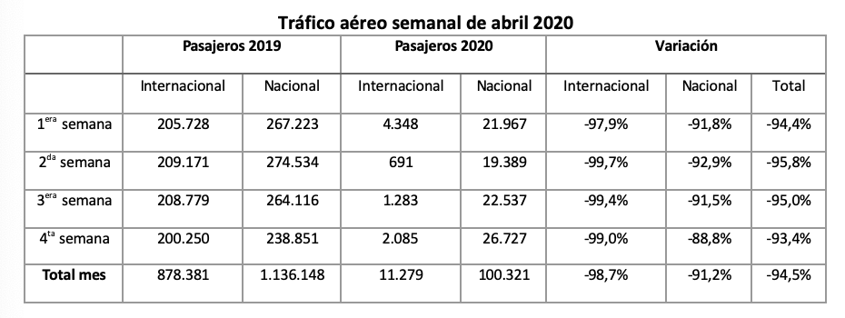 De acuerdo a las cifras durante el mes pasado, fueron transportados 111.600 pasajeros en vuelos nacionales e internacionales, lo que comparado con el mismo periodo de 2019 representa una caída de 94,5%. En marzo, la cantidad de pasajeros transportados llegó a 1.378.894.