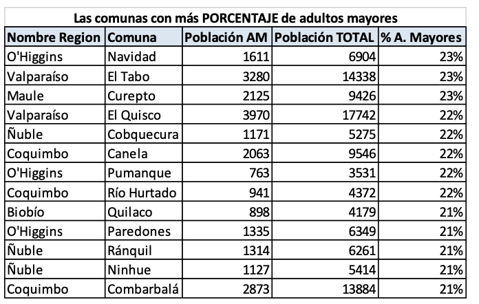 Respecto de las comunas con mayor porcentaje de adultos mayores, las cifras son las siguientes: