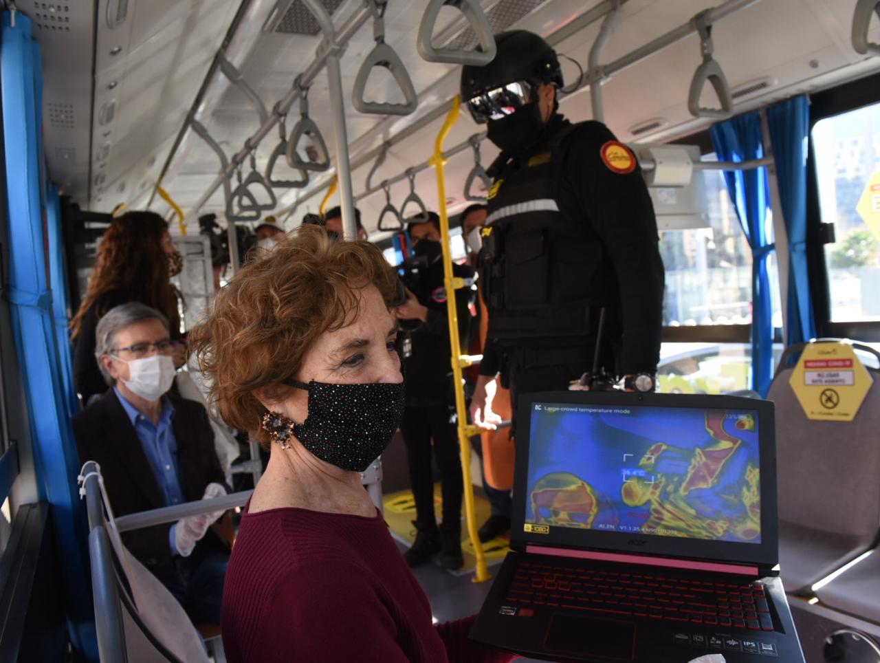 En tanto, el Alcalde de Las Condes, JoaquÃn LavÃn, explicó que se implementó un protocolo en los buses eléctricos gratuitos que circulan en la comuna: “Van a tener la mitad de la capacidad de asientos para que haya distanciamiento social. Cuando las personas suban al bus habrá un desinfectante para los zapatos, pueden sacar guantes, se mide la temperatura, hay un dispensador automático de alcohol gel y va a haber controles preventivos de temperatura con inspectores municipales que tienen un casco que mide la temperatura de las personas o de manera grupalâ€.
