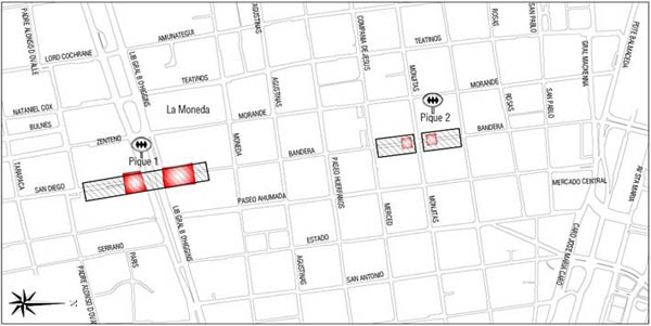 La nueva estación Universidad de Chile se emplazará en el sector de la calle San Diego, mientras que Plaza de Armas se situará en el sector de Bandera con CompañÃa. Para su construcción subterránea se realizarán tres piques que permitirán comenzar los trabajos de galerÃas y túneles: Bandera con CompañÃa, Bandera con Catedral, y San Diego entre Padre de Alonso Ovalle y la Avenida Libertador Bernardo O`Higgins.