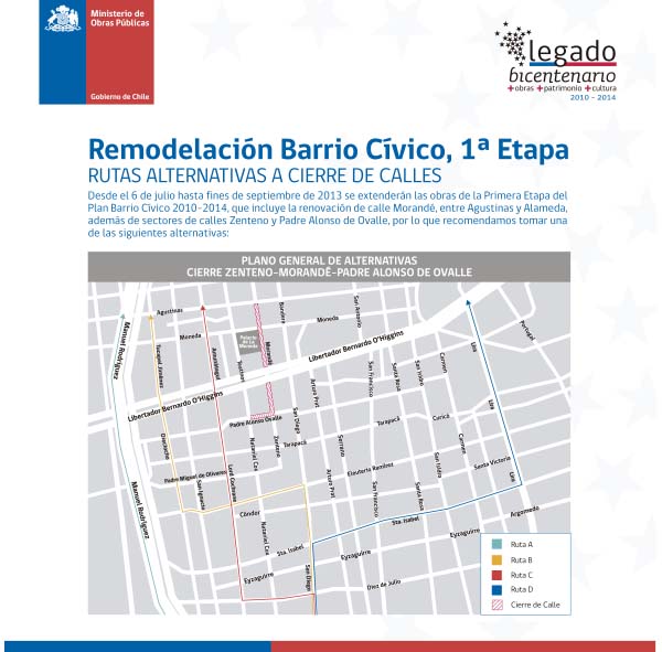 Esta mañana comenzaron los desvÃos y cortes parciales de tránsito en el eje Morandé-Zenteno y la calle Padre Alonso de Ovalle, por el inicio de las obras de pavimentación del Plan Barrio CÃvico 2010-2014, consistentes en la nivelación de la avenida Libertador General Bernardo O’Higgins, y de las calles colindantes para construir la Gran Explanada, como parte del programa Legado Bicentenario del Presidente Sebastián Piñera.