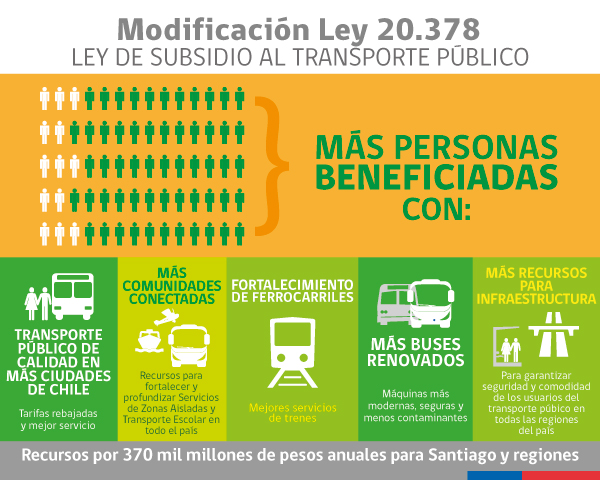 En Santiago, el proyecto asegura recursos hasta el término de las concesiones con los operadores del Transantiago (2022), lo que irá en directo beneficio de los usuarios, al asegurar la estabilización de las tarifas, ya que éstas sólo se modificarán por efectos asociados a la inflación.
