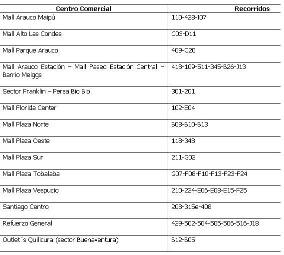 A continuación, el detalle de los recorridos que serán reforzados hacia los distintos centros comerciales y/o malls de la ciudad: