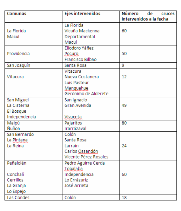 La UOCT está desarrollando un plan de revisión de los tiempos mÃnimos según las consideraciones mencionadas. Algunos ejemplos de las comunas y ejes principales en los que se han implementado aumentos en los tiempos de verde peatonal son los siguientes:
